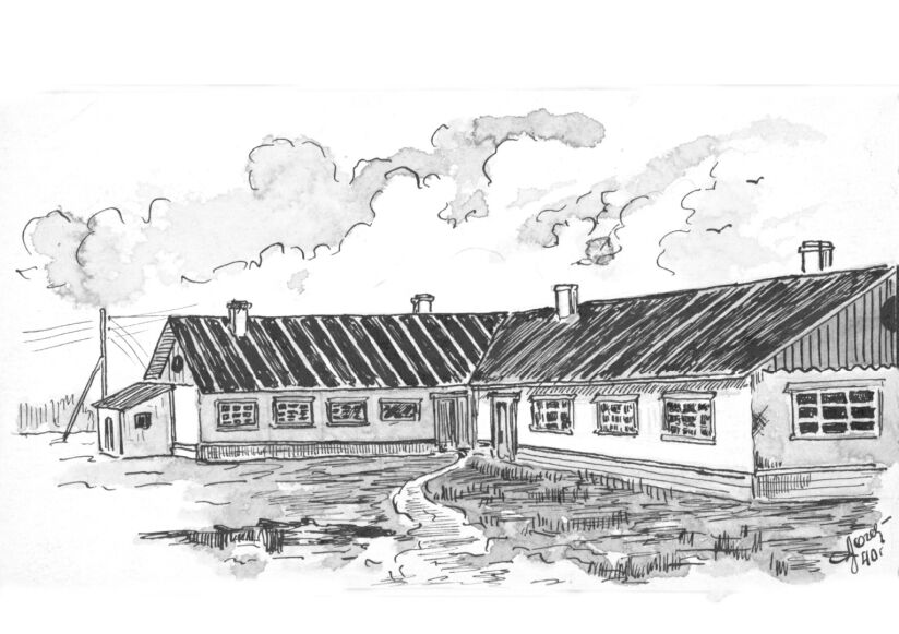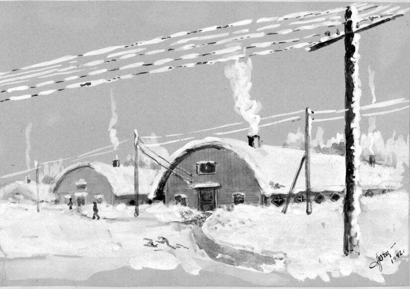 Фото. Рисунок. А. М. Очев. Сетчатые бараки. 1942 год.