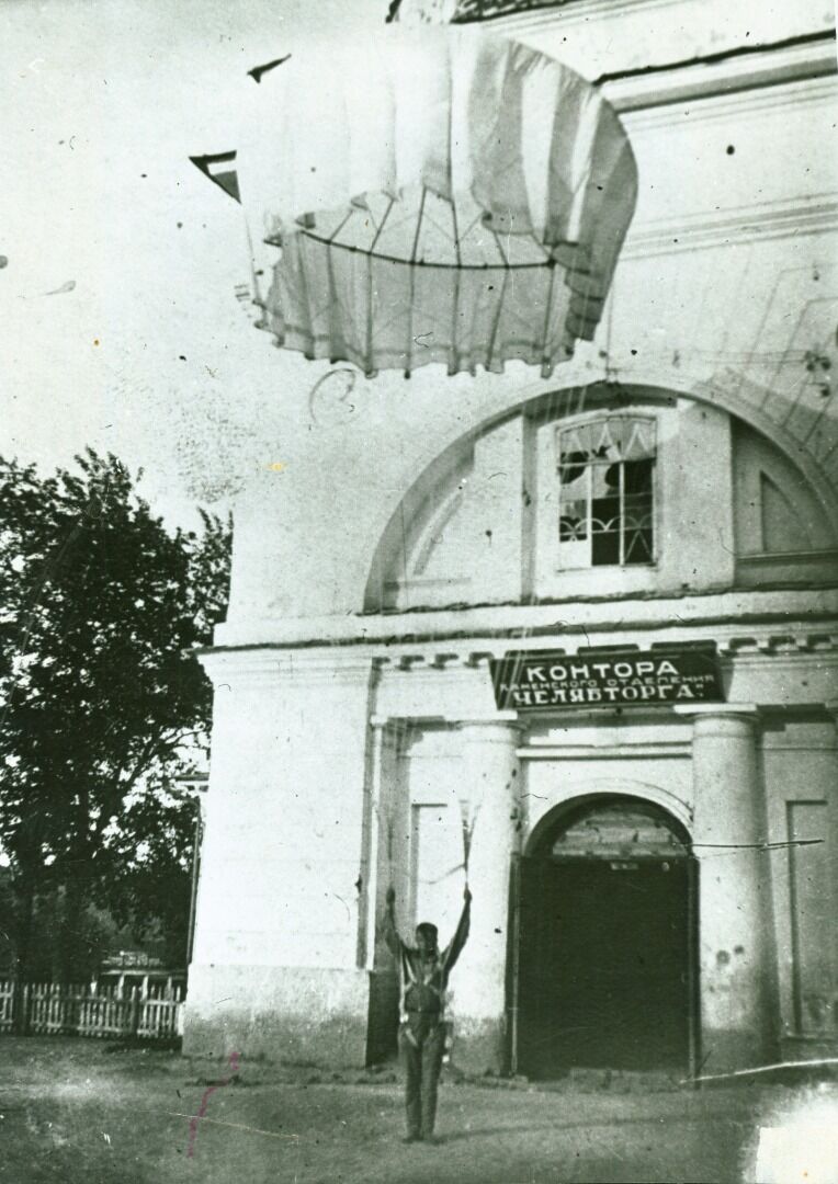 Фото. Парашютист на фоне универмага «Челябторга», расположенного в здании Свято-Троицкой церкви