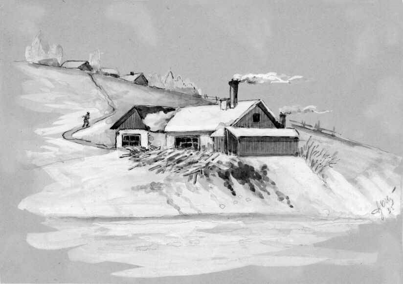 Фото. Рисунок. А.М.Очев. Баня для строителей УАЗа на берегу Исети. 1935 год