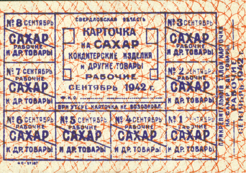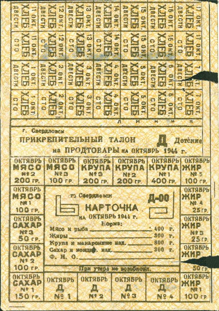 Контингент получения хлебных и жировых карточек в нашем городе, к примеру, на октябрь 1944 года составлял 97155 человек. Из них рабочих, получающих по 1000 грамм — 11799 человек, по 800 грамм — 3401, по 700 грамм — 17223, по 650 грамм — 577, по 500 грамм — 13147 человек. Служащие, получавшие по 450 грамм — 1481, по 400 грамм — 1577 человек. Самая многочисленная группа была — иждивенцы — 18132 человека и дети — 25589 человек — по 400 грамм. Учащиеся ремесленных училищ — 621 человека получали по 400 грамм, также как и работники торфяника — 85 человек. Чуть больше получали работники транспорта — 508 человек от 600 до 700 граммов. К концу 1944 года число жителей, получающих карточки возросло до 97762 человек.
