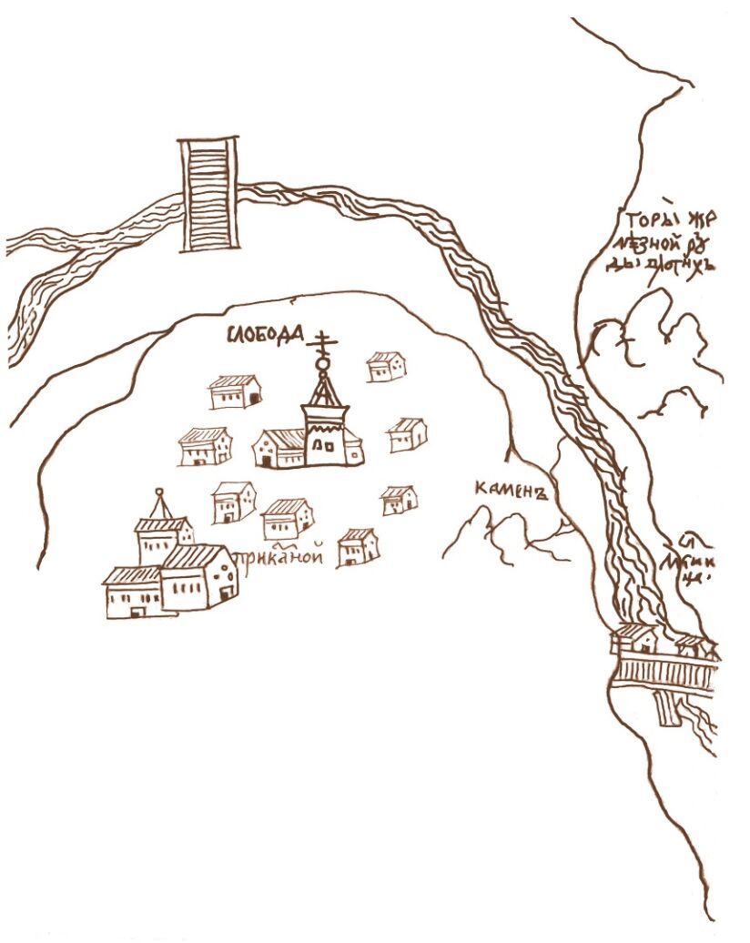 На рисунке мы видим Каменскую слободу на правом берегу Каменки и поворот реки – это угол современных улиц Луначарского и Мостовой, хорошо видны разработки железной руды на левом берегу Каменки с надписью «горы железной руды», а чуть ниже видим монастырскую мельницу с надписью «мельница», которая позже стала принадлежать заводу. Обратите внимание на две скалы под названием «камень». Эти известняковые останцы сохранились до нашего времени, правда, в «урезанном» состоянии. Этот исторический артефакт как туристический объект достоин поклонения. Во-первых его обозначил сам Семен Ульянович Ремезов, знаменитый картограф, во-вторых скала стоит на маршруте «Тропа Карпинского», а в-третьих это просто оберег старого Каменска. Он оберегает каменцев, а они его. В прошлом 2021 году жители улицы Мостовой очистили камень от зарослей, открыли его пространство, рядом сделали детскую площадку и площадку для отдыха. Спасибо всем неравнодушным, кто принимал в этом участие.