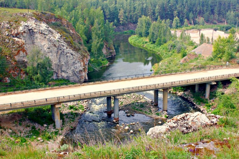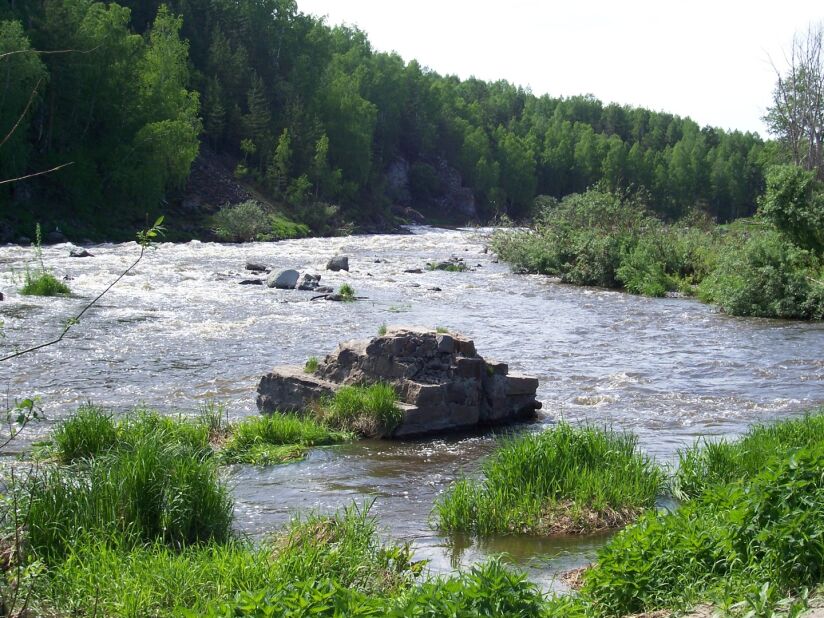 Далее ниже по течению, на левом берегу Исети у висячего моста, ведущего на п. Мартюш, когда-то находилось здание рудоуправления, затем база отдыха мясокомбината. В настоящее время остался только фундамент.