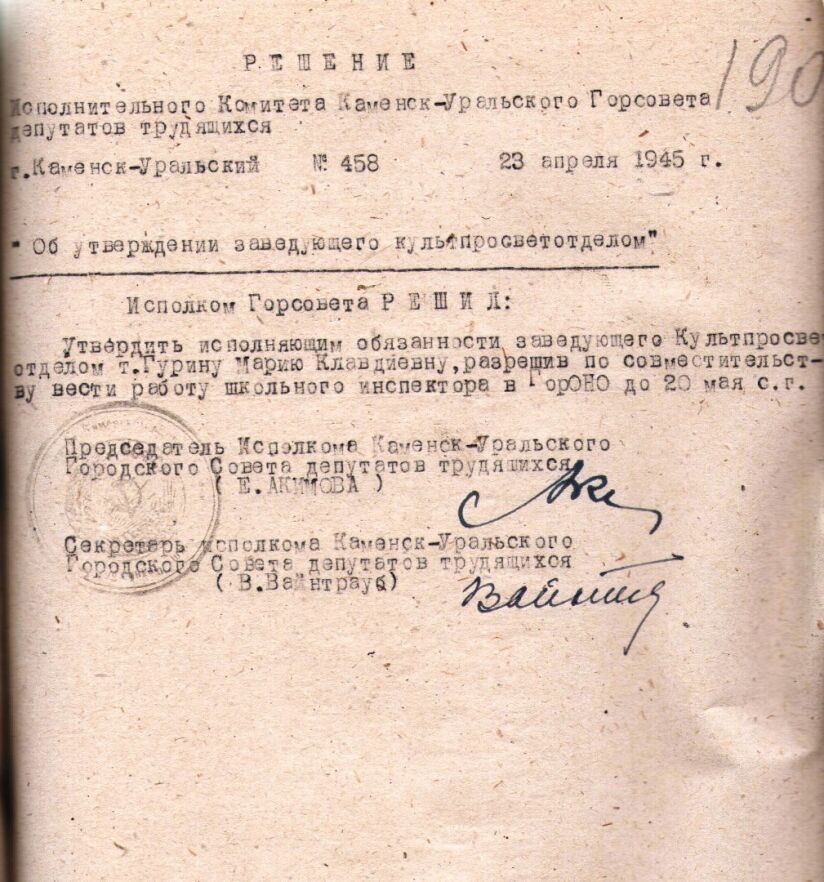 В результате активной культурно-массовой деятельности в городе горисполком принял решение за № 458 от 23.04.1945 г. «Утвердить исполняющим обязанности Культпросветотделом т. Гурину Марию Клвдиевну, разрешив по совместительству вести работу школьного инспектора в ГорОНО до 20 мая с.г.».
