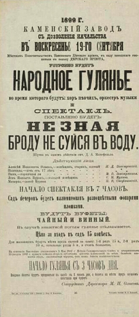 Театральных постановок за один вечер, обычно, было две. Поэтому многие актеры довольно большой труппы, могли выйти на сцену и показать свое мастерство. В 1899 году на афишах появились новые имена каменских артистов, например, в спектакле «Светит да не греет» участвовали И. С. Дмитриева, Л. К. Карпова, М. Я. Шамарина, Е. П. Смоленская, Н. Э. Штанге, который исполнил главную роль в «Свадьбе Кречинского». В спектакле «Медведь» главную женскую роль сыграла некто С. Л. Соболевская, вероятно, она была приглашенной, т. к. ее фамилия больше не упоминалась на афишах. А вот местных фамилий новых участников на афишах 1899 года появилось несколько. Это К. Шишова, К. Дмитриева, М. Плотникова, А. Колмогорцева, Ю. Мухина, А. Заостровская, М. Заостровская, И. Щеликова, И. Заостровский, С. Мухин, И. Носков, И. Овчинников, И. Шаньгин, Г. Засыпкин (а).