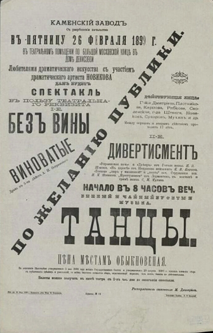 Афиши 1899 года были в основном печатными, хотя есть и рукописные. Читая их, мы узнаем, что спектакли проходили в доме Денисова, в специально устроенном помещении по улице Большой Московской. В постановках кроме местных артистов принимал участие, вероятно, и приглашенные «звезды». Заезжих актеров на афишах анонсировали крупным шрифтом, например, «драматического артиста И. Т. Новикова». Денежный сбор с первого январского спектакля 1899 года пошел в пользу голодающих от неурожая 1898 года.