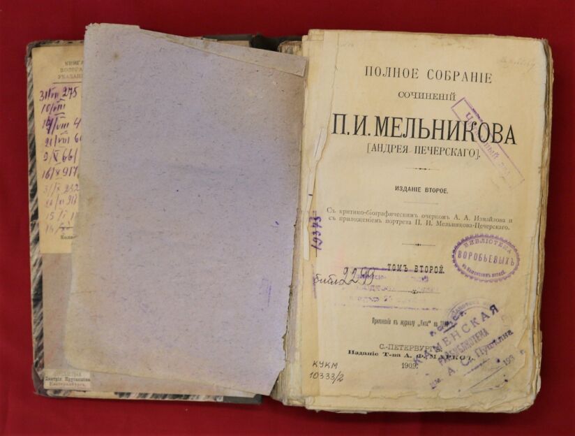 В 1976 году Центральная городская библиотека имени А.С. Пушкина передала краеведческому музею часть списанных книг, когда-то принадлежавших бесплатной библиотеке-читальне, основанной в Каменском заводе в 1899 году, а затем и Каменской Райбиблиотеке имени А.С. Пушкина. Свыше восьми сотен книг. Среди них произведения В.А. Жуковского, С.Т. Аксакова, Л.Н. Толстого, Ф.М. Достоевского, И.А. Бунина, В.Г. Белинского, А.Ф. Писемского, В. Шекспира, Ж.-Б. Мольера, Г. Гейне, Г. Ибсена, Ф.К. Шлоссера и иных российских и зарубежных писателей. Был среди них и второй том из Полного собрания сочинений П.И. Мельникова (Андрея Печерского), изданный Товариществом А.Ф. Маркса в 1909 году.