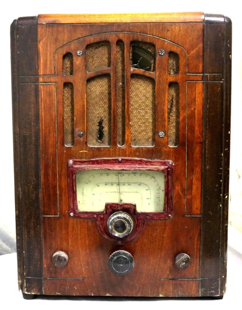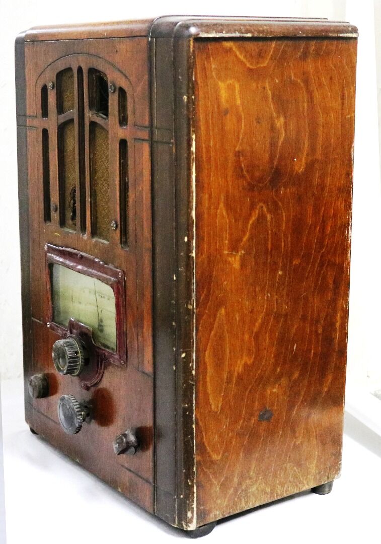 Его габариты 380х480х225 мм. Собран приемник в деревянном лакированном корпусе. Шкала проградуирована в кгц, с отметкой вещательных КВ диапазонов. Рабочий диапазон на шкале подсвечен треугольником. Обрамление шкалы сделано из медного сплава и видимо, покрашено лаком бывшими владельцами.