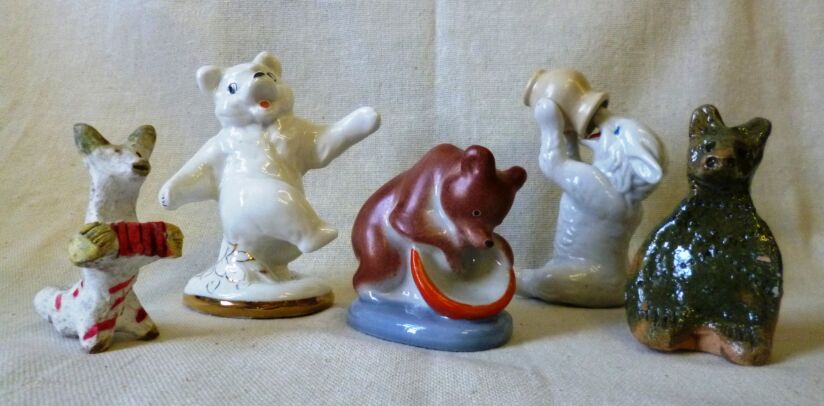Архаичные черты хранят необычные и забавные глиняные игрушки, изготовленные мастерами из сёл Хлуднево (Калужской области) и Александра-Прасковьинка (Рязанской области). Любуясь этими игрушками, непроизвольно погружаешься в те времена, когда человек отождествлял себя с медведем. Не случайно русских сравнивают именно с медведями в их нерасторопности и незлобливости, с одной стороны и умении постоять за себя с другой. Медведь считался символом добродушия и ярости, богатырской силы и неуклюжести, обжорства и нежных материнских чувств.