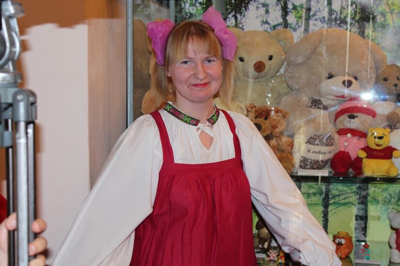 Открывать выставку помогали старшему научному сотруднику музея Алле Лесуновой, мульт персонажи Маша и Медведь.