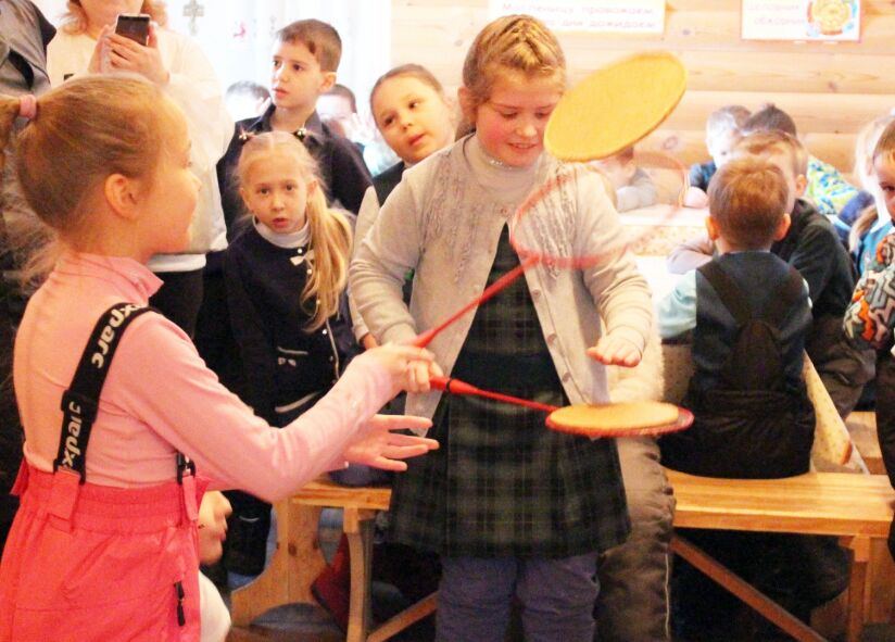 Встречает всех хозяюшка в русском сарафане, сразу настраивая юных посетителей на некий сказочный лад. А затем, вместе с озорным Антошкой, в шутливой форме знакомят с традициями масленицы, отгадывают загадки, водят хороводы.