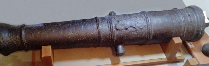 80 пушек трехфунтовых, 6 – шестифунтовых и 1 восьмифунтовая. Кроме того, у 16 пушек оторвало дельфины.