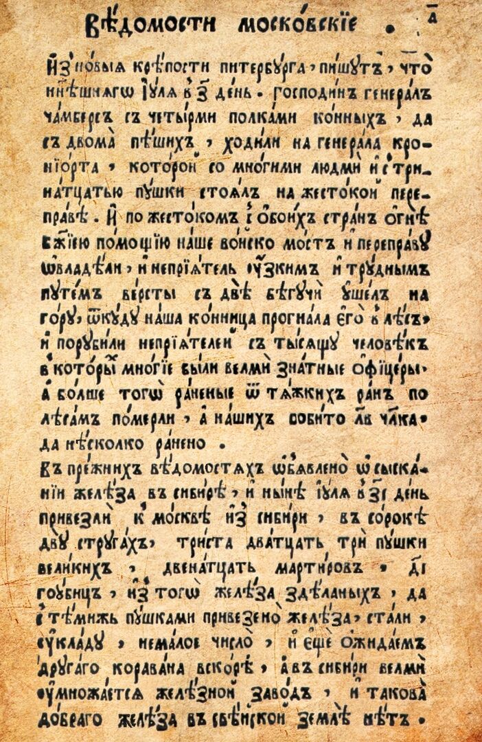 Газета выходила нерегулярно, периодичность была различной. В 1703 и 1704 гг., к примеру, вышло по 39 номеров. Первый номер назывался «Ведомости», а третий номер - «Ведомости Московские». Вот в этом номере от 18 июля 1703г. есть сообщение о сибирских железных заводах.