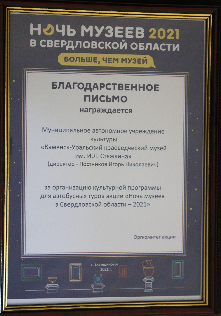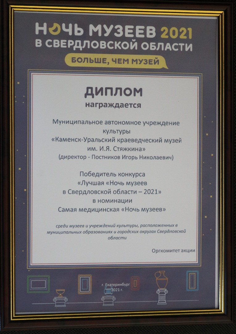 Вчера, 21 мая, в Екатеринбурге были подведены итоги "Ночи музеев 2021" в Свердловской области. Эксперты назвали лучшие площадки. Каменск-Уральский краеведческий музей им. И.Я.Стяжкина получил 2 награды - в номинации «Самая «медицинская» Ночь музеев в Свердловской области» и за организацию культурной программы для автобусных туров.