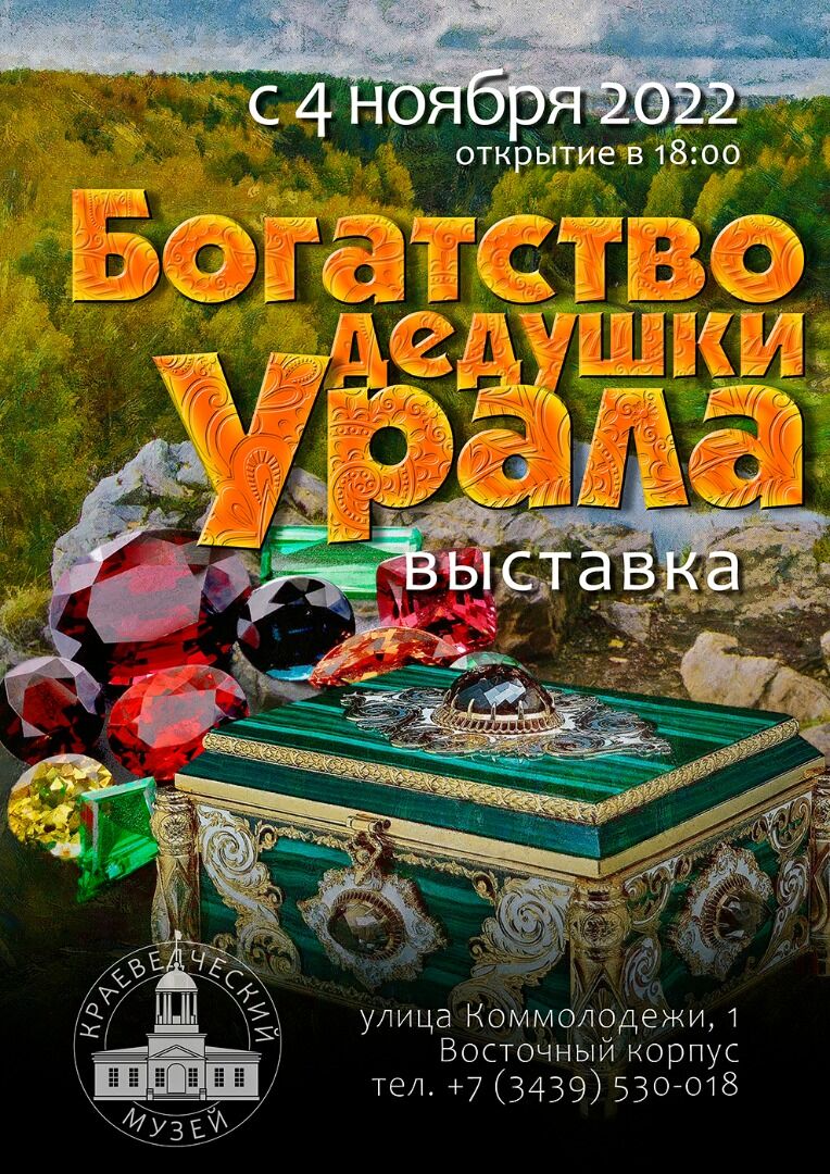4 ноября 2022 года в Восточном корпусе Каменск-Уральского краеведческого музея им. И.Я. Стяжкина откроется выставка «Богатство дедушки Урала». Урал по праву называют сокровищницей России. Разнообразные запасы полезных ископаемых с давних пор сделали Урал важнейшим экономическим районом России. Почти пять столетий добываются здесь соли; около трёхсот лет эксплуатируются железорудные и медные месторождения; в течение двух с лишним столетий извлекаются золото, различные самоцветы и драгоценные камни.