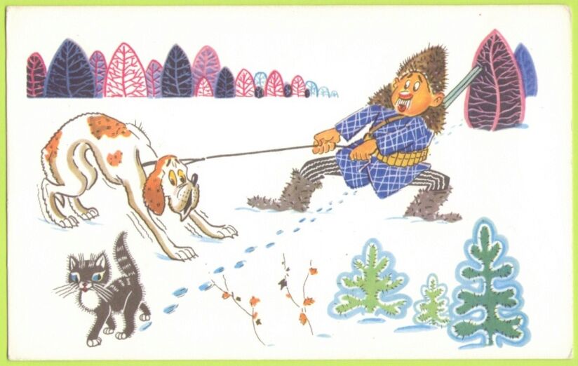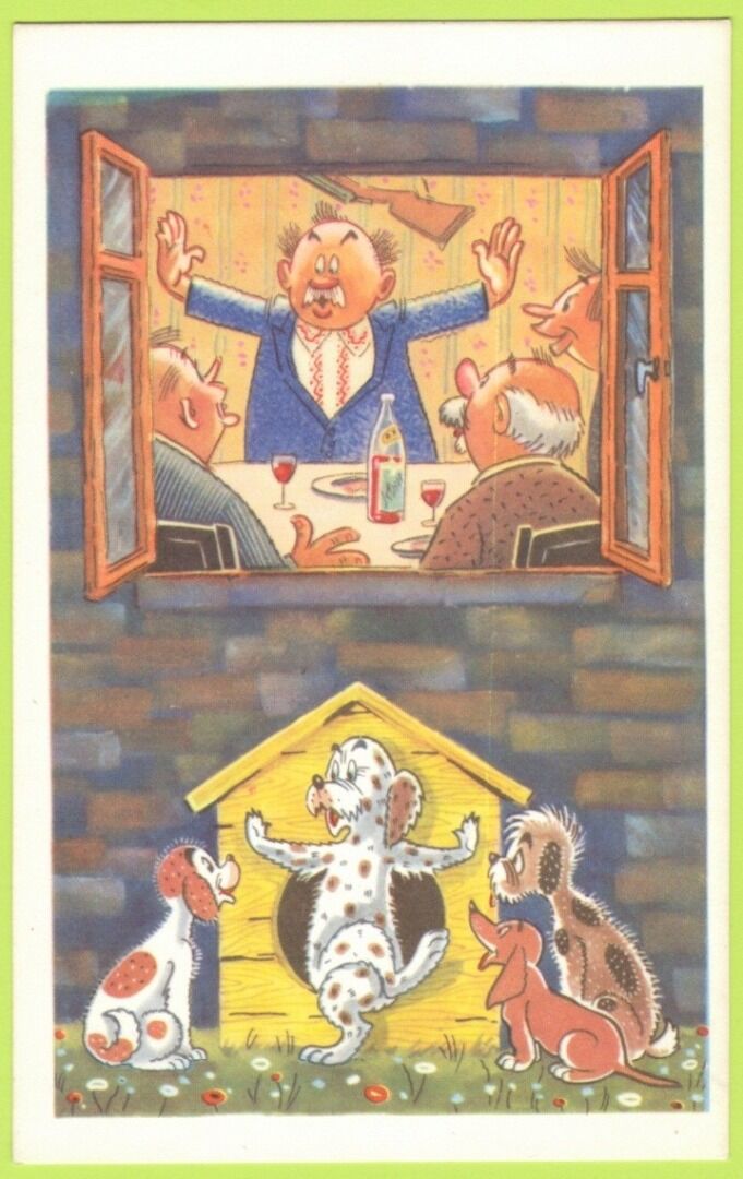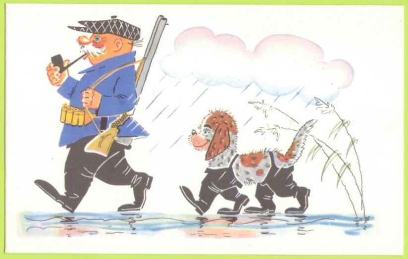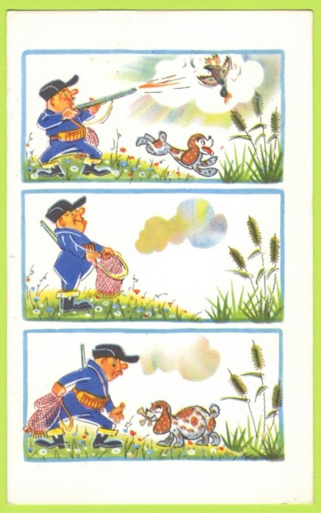 На 12 открытках – озорной мир юмористических образов охотников и рыбаков в карикатурах блистательного дуэта художников А. Орлова и А. Шварца. Эти открытки были выпущены серией в 1968 году. К сожалению, о художниках известно лишь, что они работали в художественном отделе журнала «Охота и охотничье хозяйство», а с 1964 года в альманахе «Охотничьи просторы».