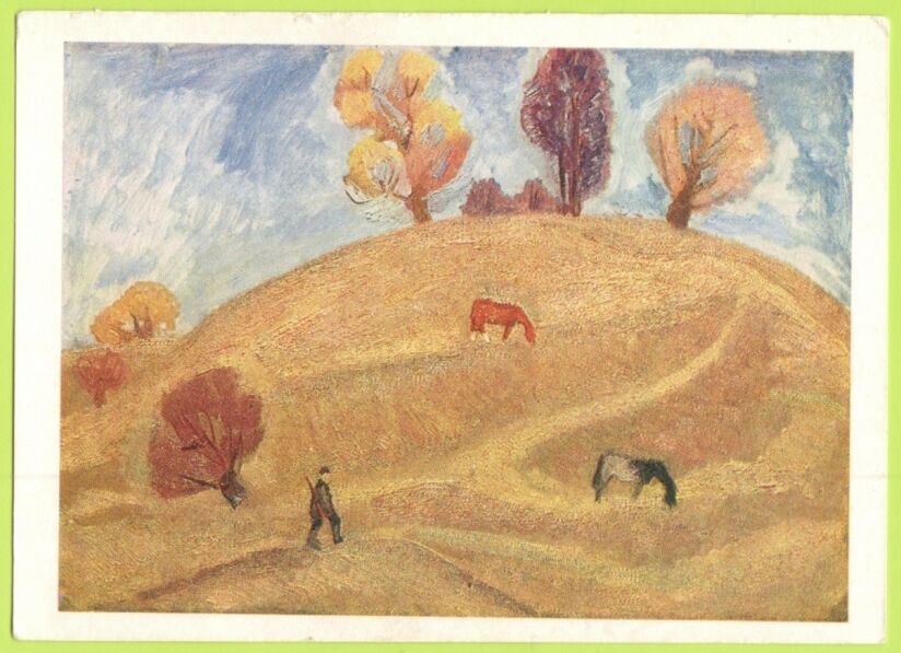 На второй открытке, изданной в 1984 году – «Пейзаж с охотником». Художник-живописец и график Виктор Ефимович Попков (1932-1974) создал картину в 1965 году. В лаконичности деталей, реалистичности образов, сухости оттенков прослеживается “суровый стиль”, присущий работам В.Е. Попкова.