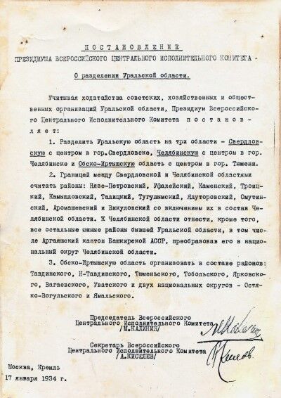 Постановлением президиума ВЦИК от 17 января 1934 г. Уральская область упразднена, на ее месте созданы Челябинская (60 районов), Свердловская (63 района) и Обь-Иртышская (9 районов) области.