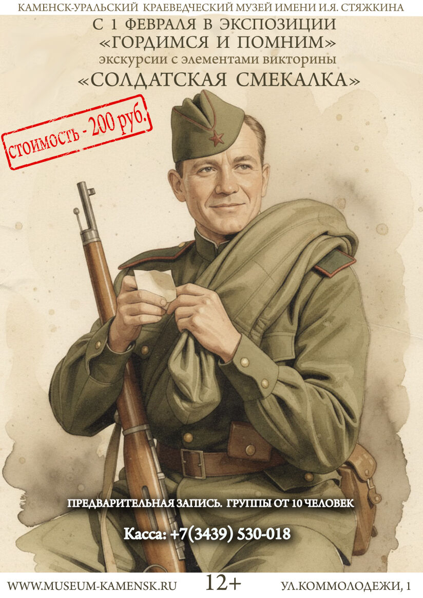 Краеведческий музей приглашает школьников на экскурсию с элементами викторины по экспозиции "Гордимся и помним". Во время экскурсии участники смогут проявить смекалку, почувствовать себя солдатом, попробуют правильно намотать портянки, оказать медицинскую помощь боевому товарищу и многое другое.